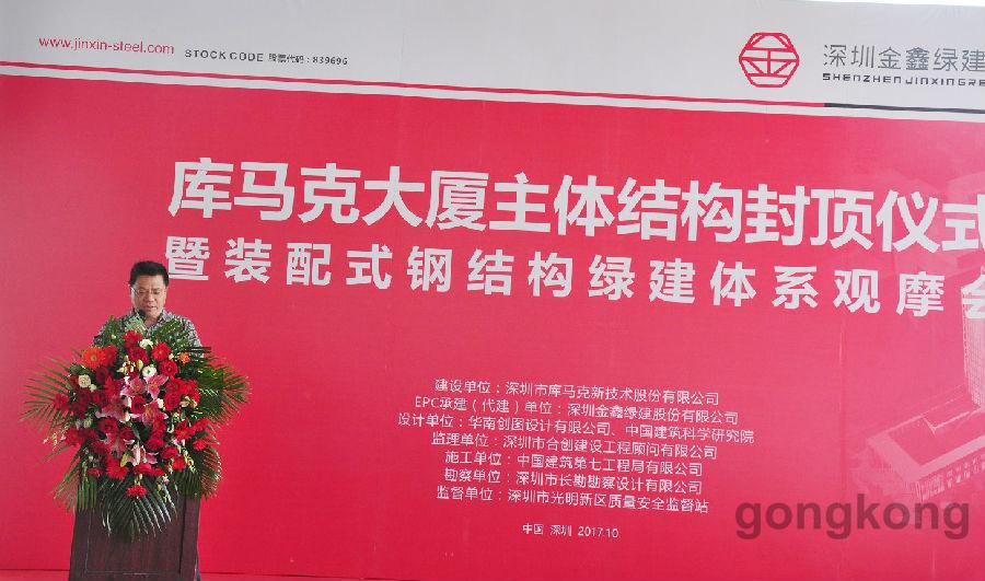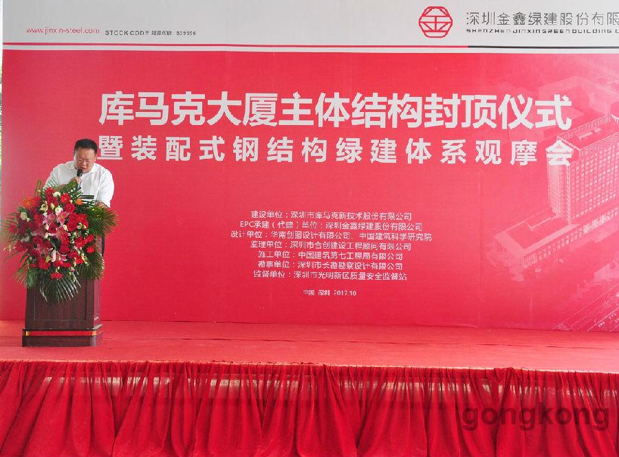 深圳市庫馬克新技術股份有限公司董事長李瑞常、深圳金鑫綠建股份有限公司董事長張楓、中國建筑第七工程局南方公司副總經理司翔、深圳市節能協會榮譽會長郝英吉、中國建筑科學研究院深圳分院總工程師劉建、深圳市合創建設工程顧問有限公司副總經理胡志毅出席封頂儀式并致辭致賀詞。庫馬克大廈建設項目,管理一流、資源節約、環境友好、建設過程節水、節材、無揚塵,庫馬克大廈按綠色三星標準建設。